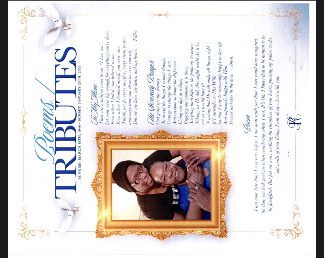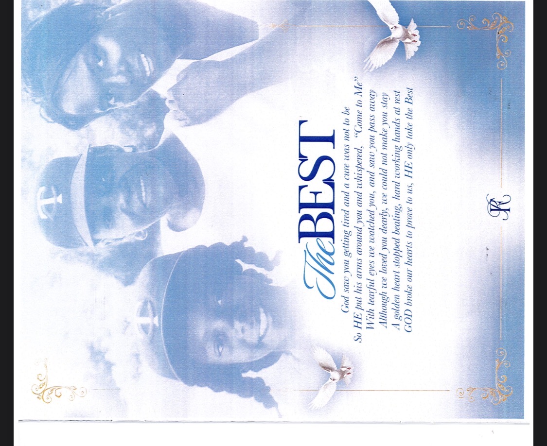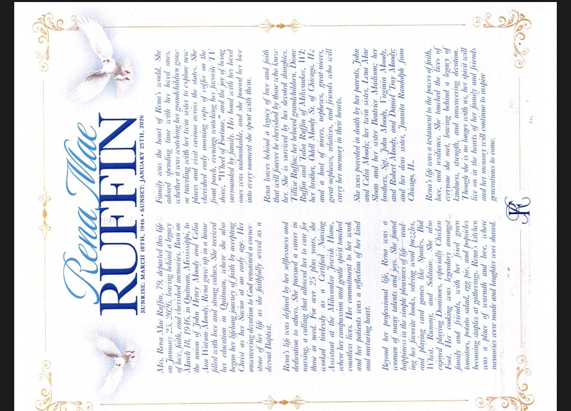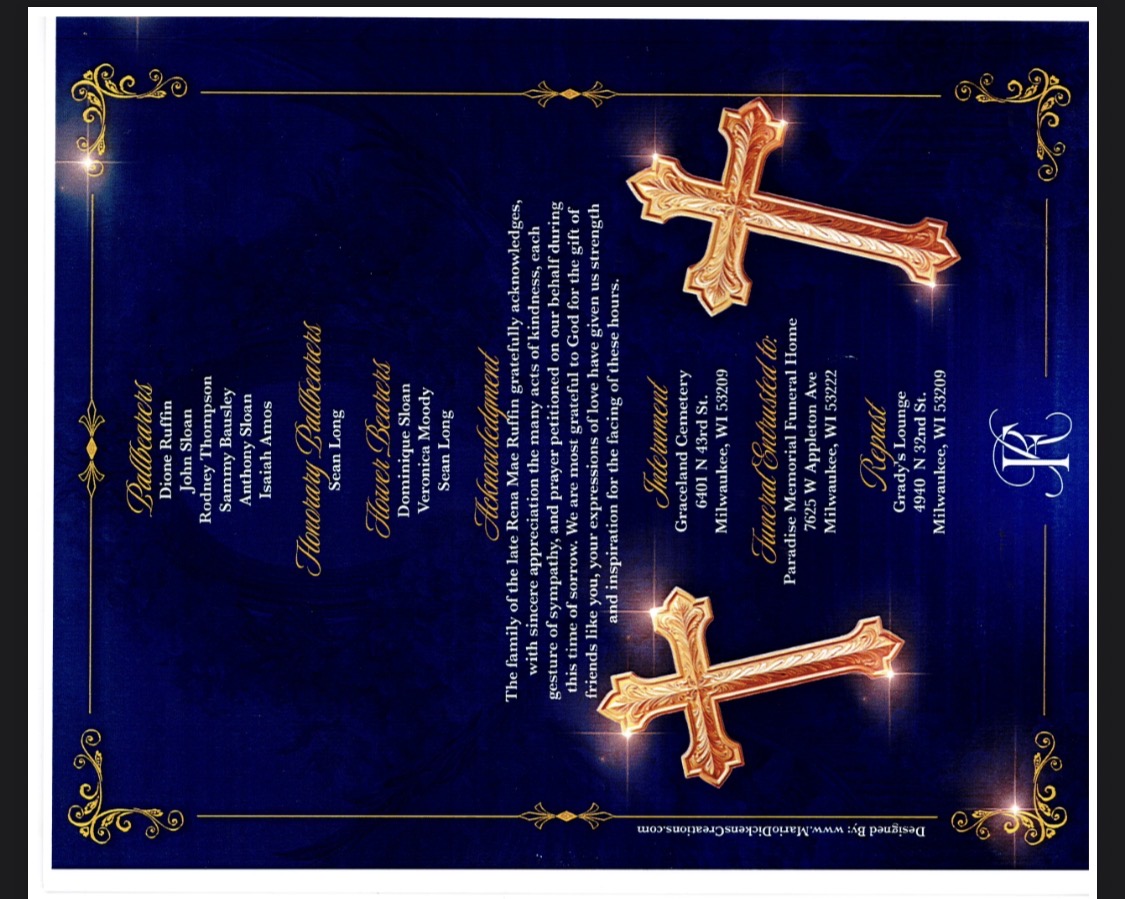 Aunt Rena, thank you for all the love you showed me when I was growing up! Every time you came to visit from Detroit, you always had something for me. And when you had your daughter, I was right there to save her by stealing her name from my best friend’s sister from church! Thank you for being there when I lost my mother and taking care of my daughter when she could not take care of herself! Aunt Rena, we will love and miss you until we meet again! -